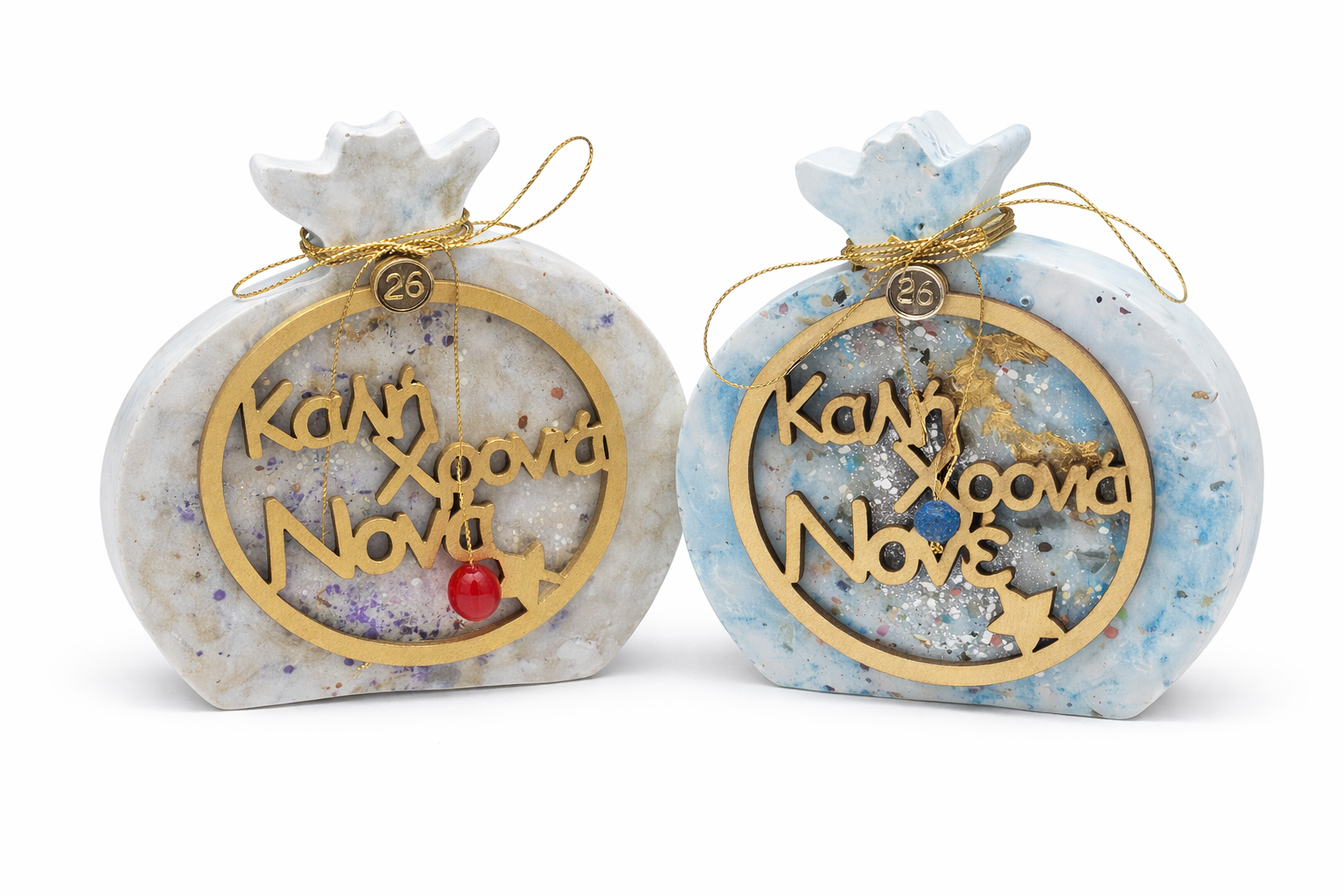 Χειροποίητο Πορσελάνινο Γούρι Ρόδι με Ξύλινα Στοιχεία – Καλή Χρονιά Νονέ / Νονά.